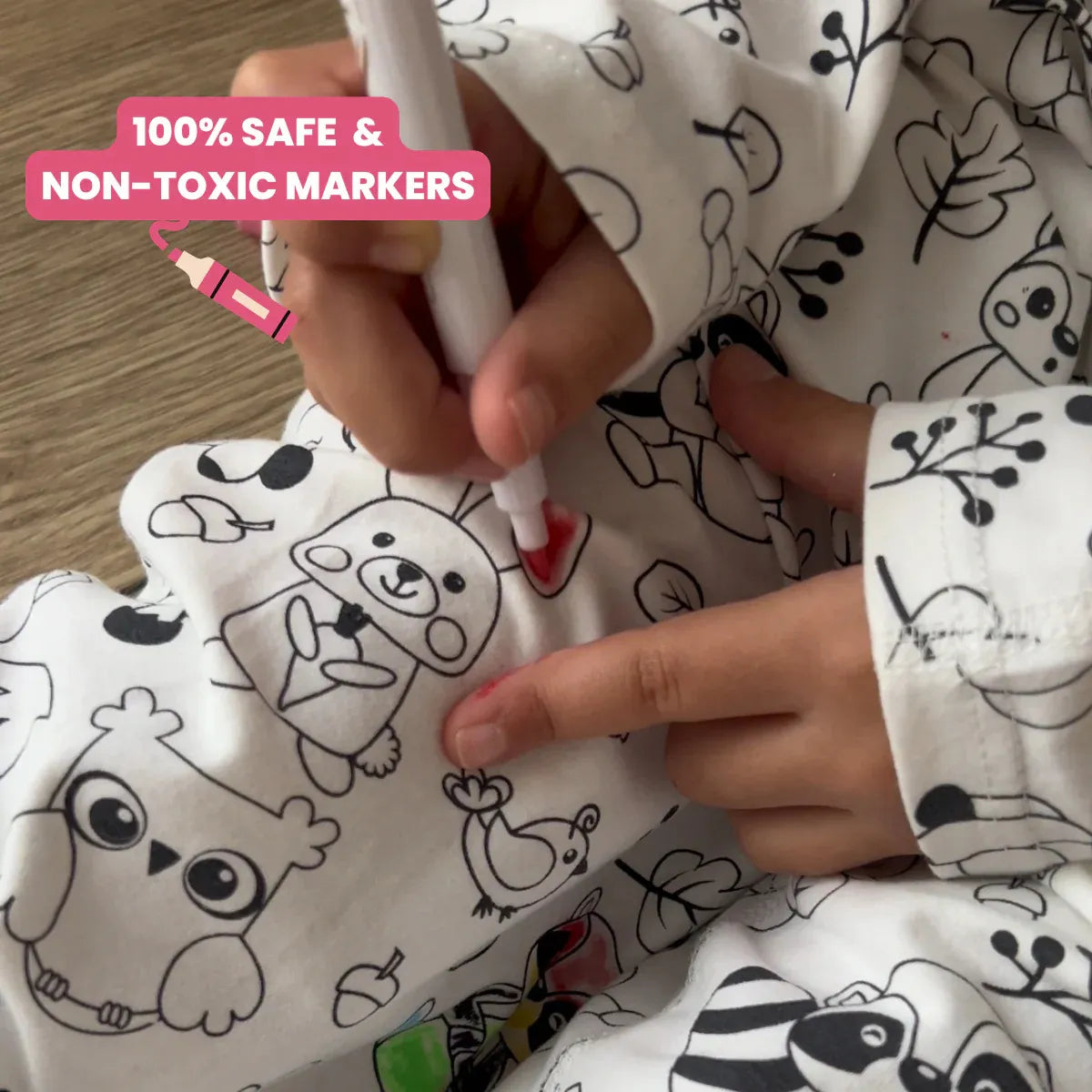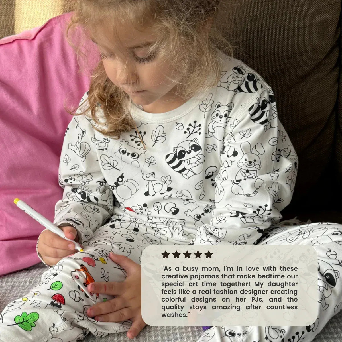 🧠 Spodbujanje domišljije in samostojnosti – otrok sam izbere barve in oblikuje svojo pižamo, kar povečuje ustvarjalno razmišljanje.