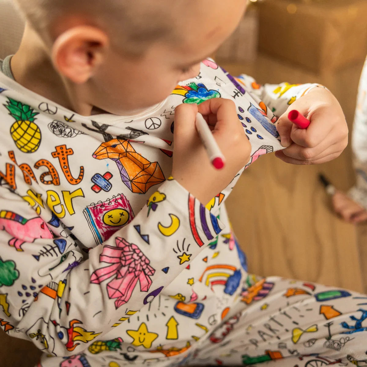 Ta dvodelna pižama Pobarvaj me prinaša ure ustvarjalnosti in zabave, hkrati pa je odlična alternativa zaslonom. Idealna izbira za rojstnodnevne zabave, družinske večere ali sproščujoče popoldne doma! Ko otrok barva svojo pižamo, krepi samozavest, spodbuja ljubezen do ustvarjanja in razvija domišljijo. Popestrila bo vse deževne dni, druženje s prijatelji ali počitnice. Naj male roke ustvarjajo in uživajo v čarobni barvni pustolovščini! ✨