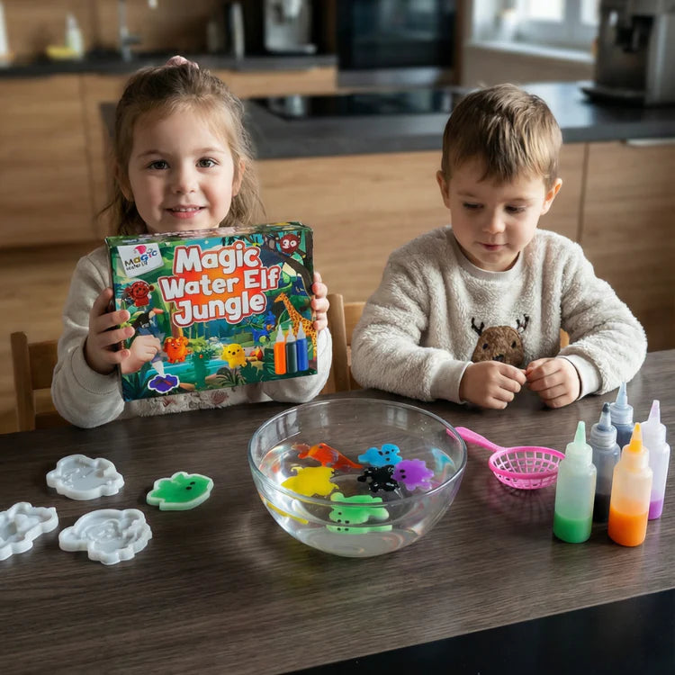 Paket Čarobni vodni škrati otrokom omogoča ustvarjanje znova in znova. Vsak tematski svet prinaša nove oblike, barve in kombinacije, zato igra nikoli ni enaka 🎨✨. Otroci lahko preizkušajo, mešajo barve, dodajajo bleščice in opazujejo, kako njihovi škrati v vodi oživijo – kar spodbuja domišljijo, radovednost in veselje do ustvarjanja 💧🧚♂️.