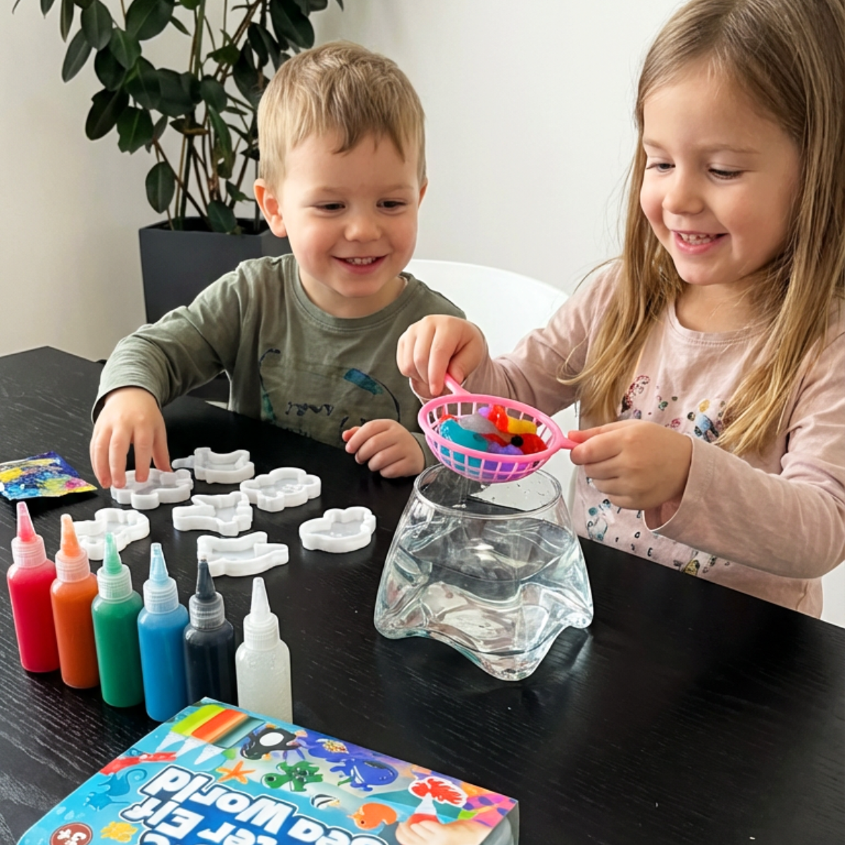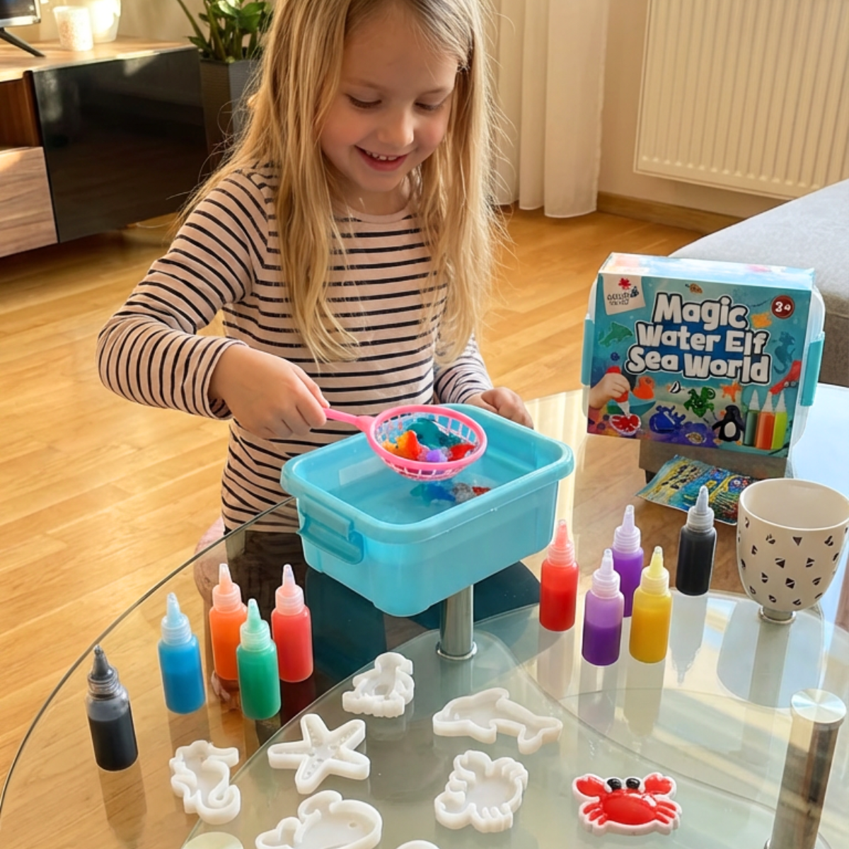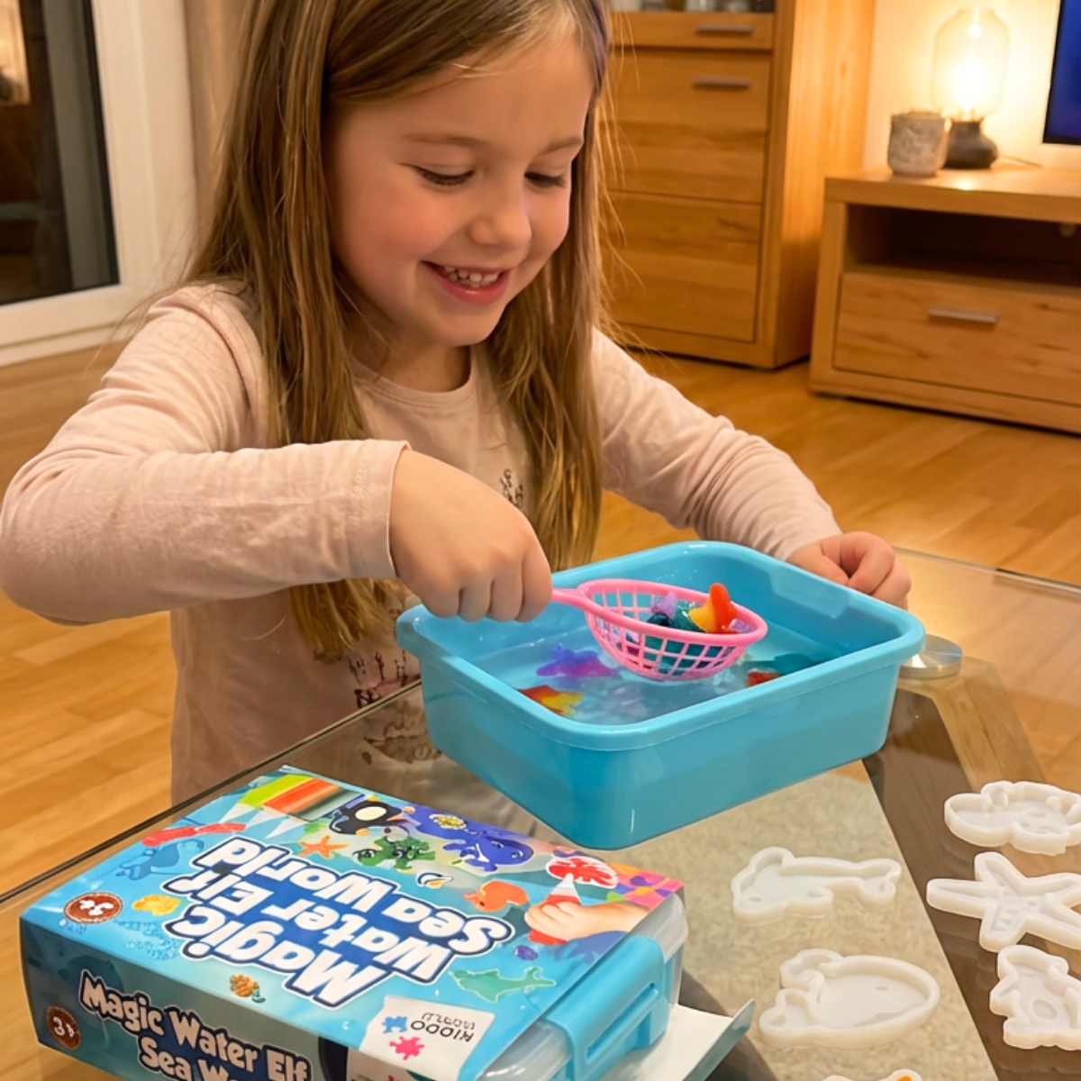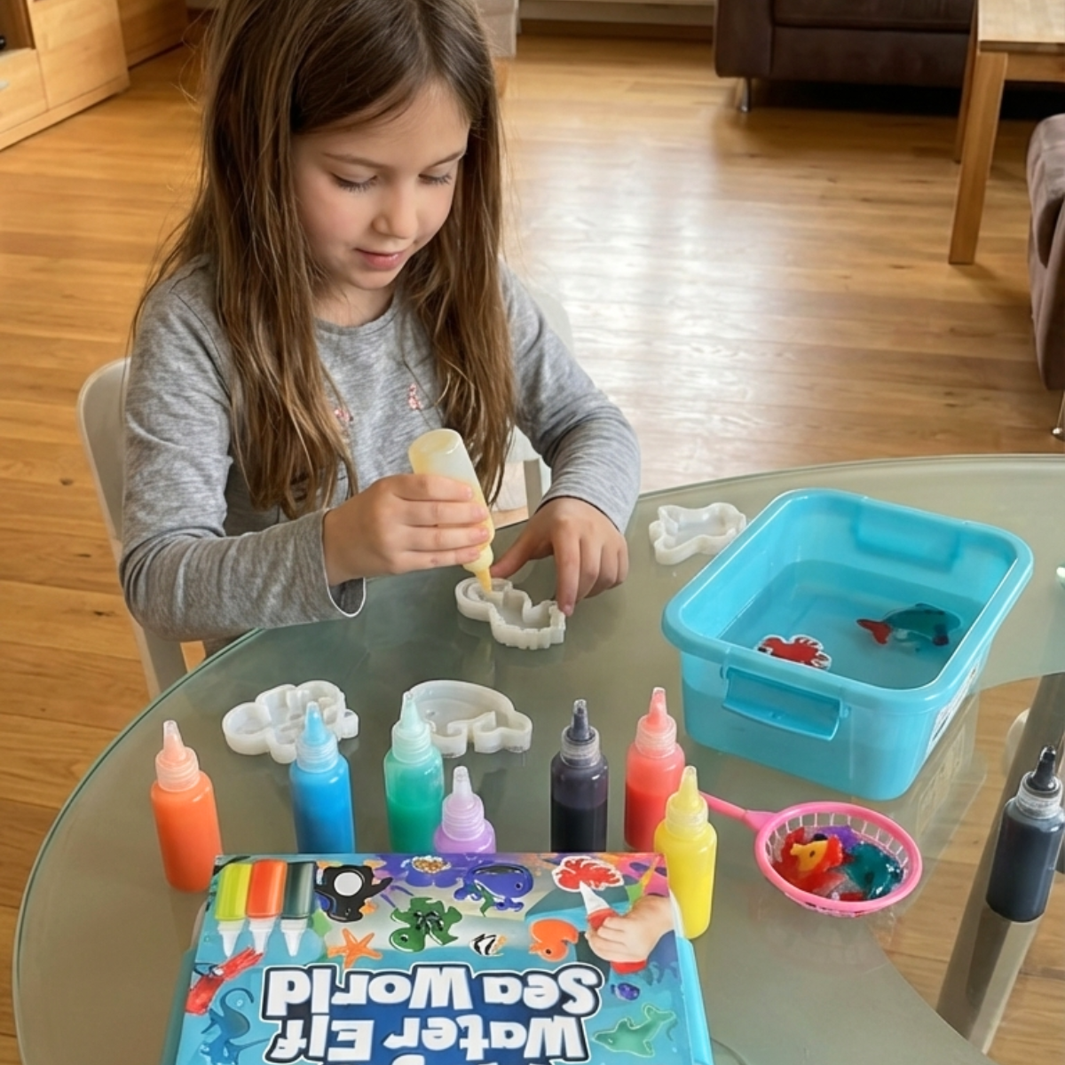21-delni ustvarjalni komplet otrokom omogoča, da z uporabo različnih barv, bleščic in vode ustvarijo svoj vodni svet, poln bleščečih morskih bitij in podvodnih prizorov. Skozi ustvarjanje otroci sproščajo svojo domišljijo, oblikujejo vodne figurice ter se na zabaven način učijo prepoznavanja barv, oblik in ročnih spretnosti.