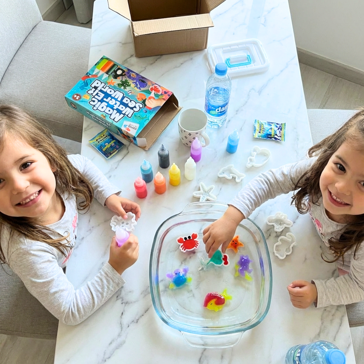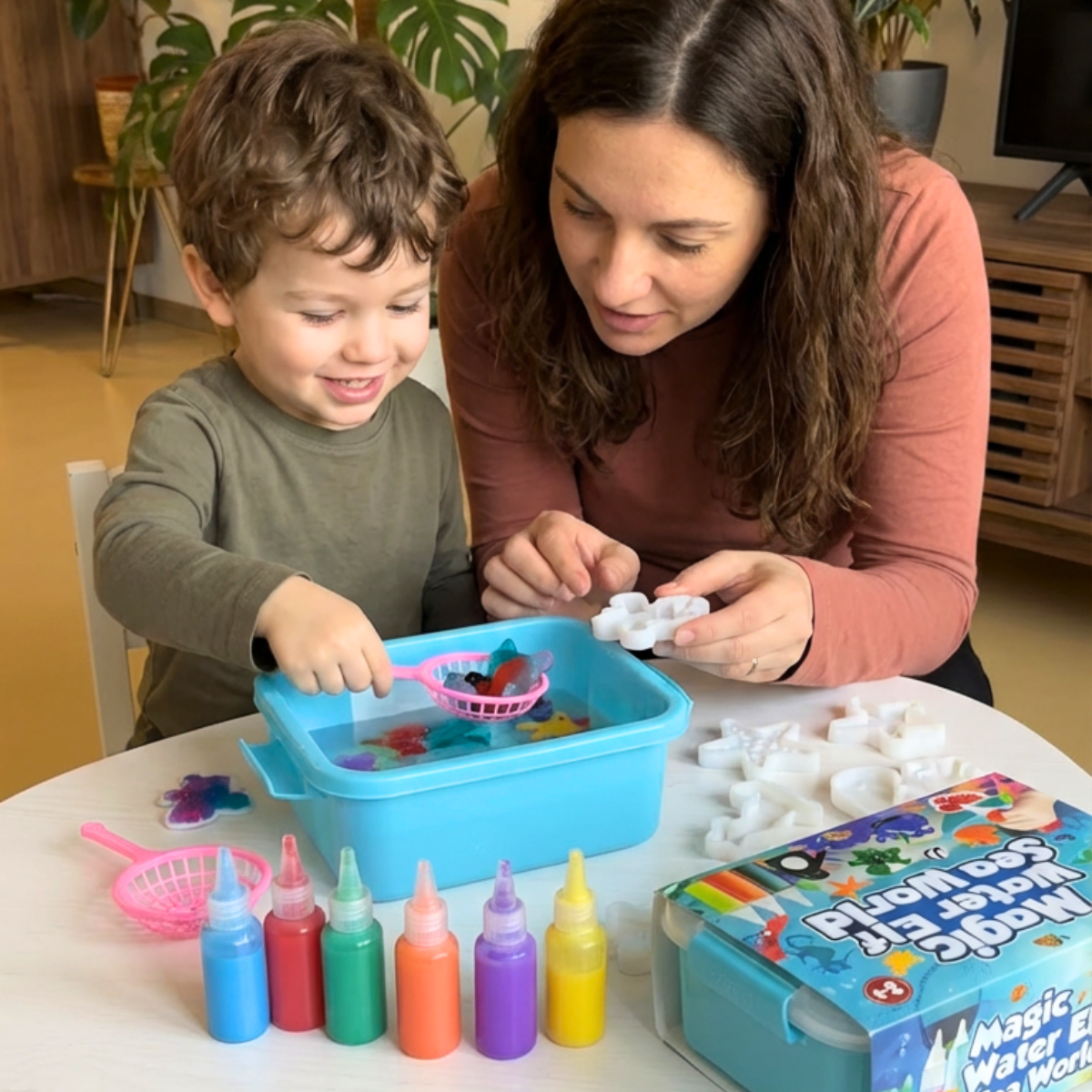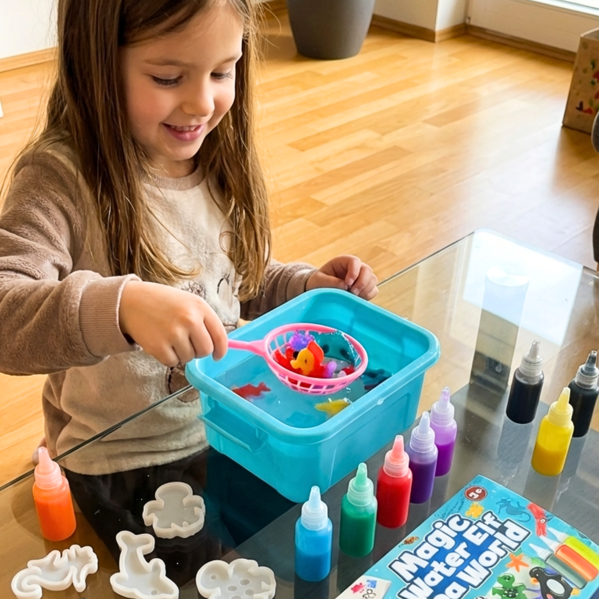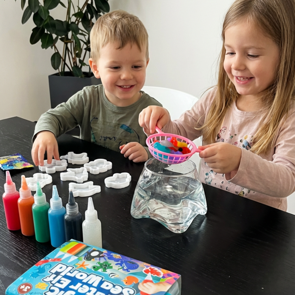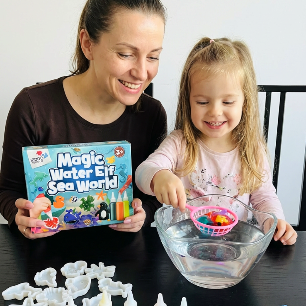 21-delni ustvarjalni komplet otrokom omogoča, da z uporabo različnih barv, bleščic in vode ustvarijo svoj vodni svet, poln bleščečih morskih bitij in podvodnih prizorov. Skozi ustvarjanje otroci sproščajo svojo domišljijo, oblikujejo vodne figurice ter se na zabaven način učijo prepoznavanja barv, oblik in ročnih spretnosti.