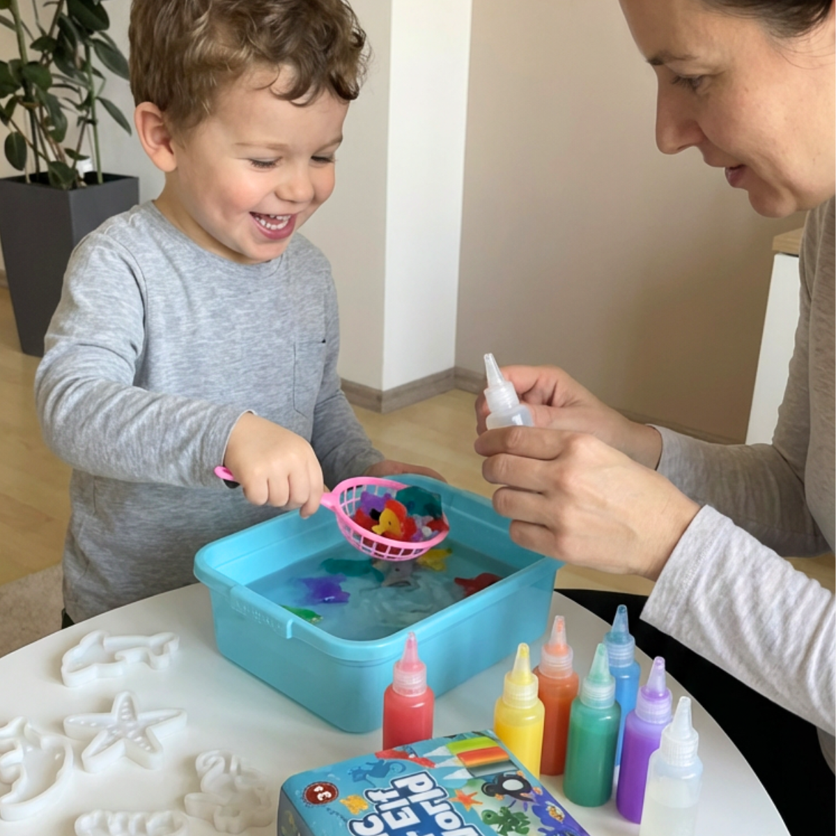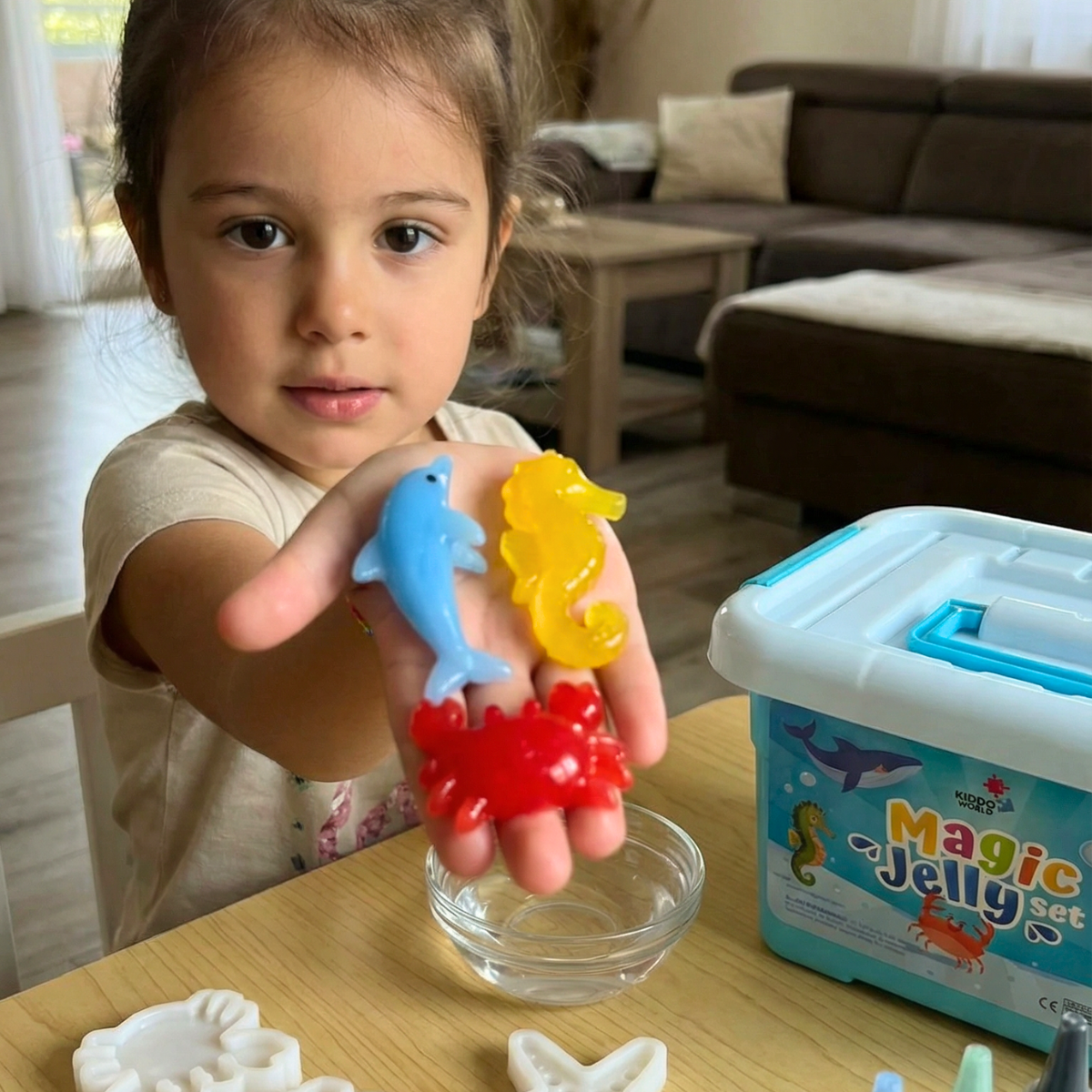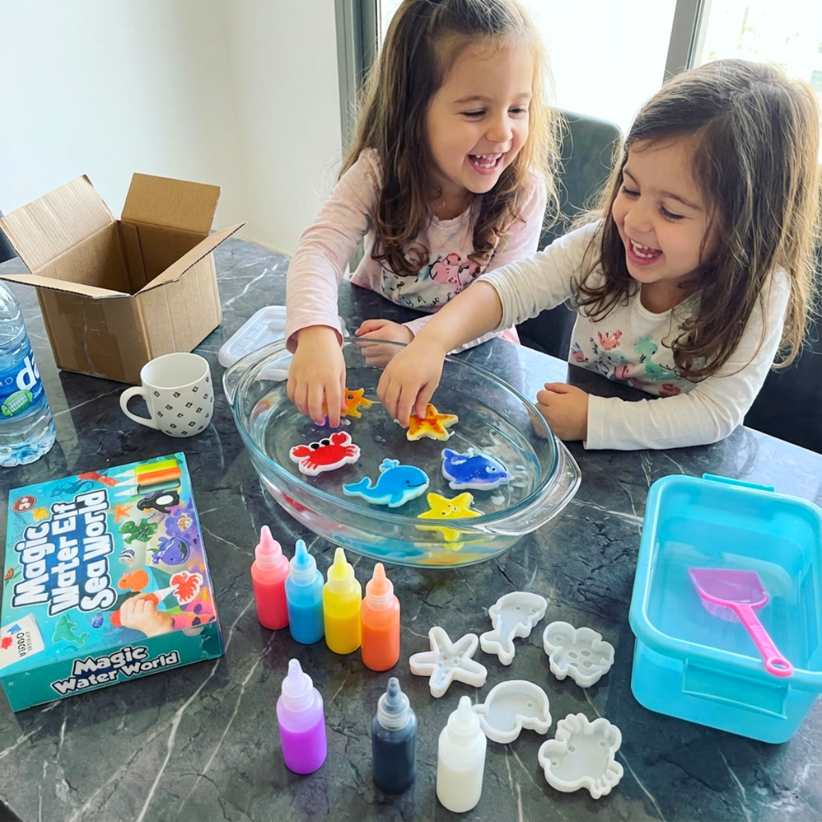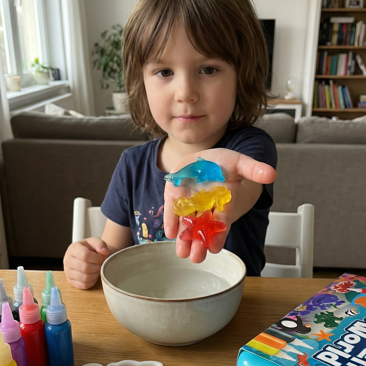 21-delni ustvarjalni komplet otrokom omogoča, da z uporabo različnih barv, bleščic in vode ustvarijo svoj vodni svet, poln bleščečih morskih bitij in podvodnih prizorov. Skozi ustvarjanje otroci sproščajo svojo domišljijo, oblikujejo vodne figurice ter se na zabaven način učijo prepoznavanja barv, oblik in ročnih spretnosti.