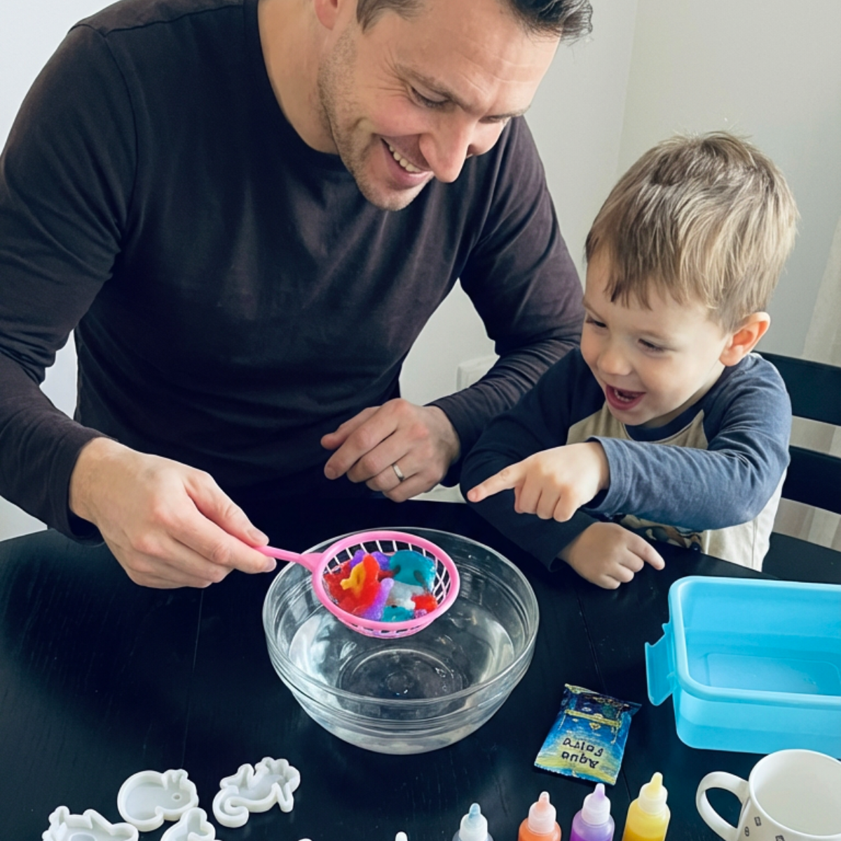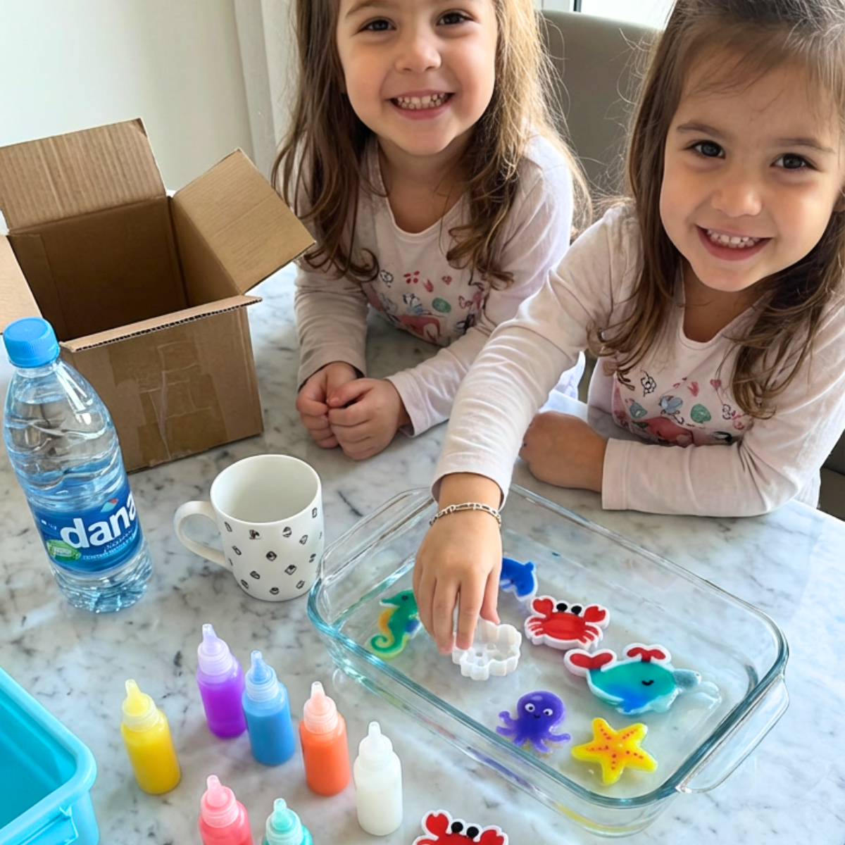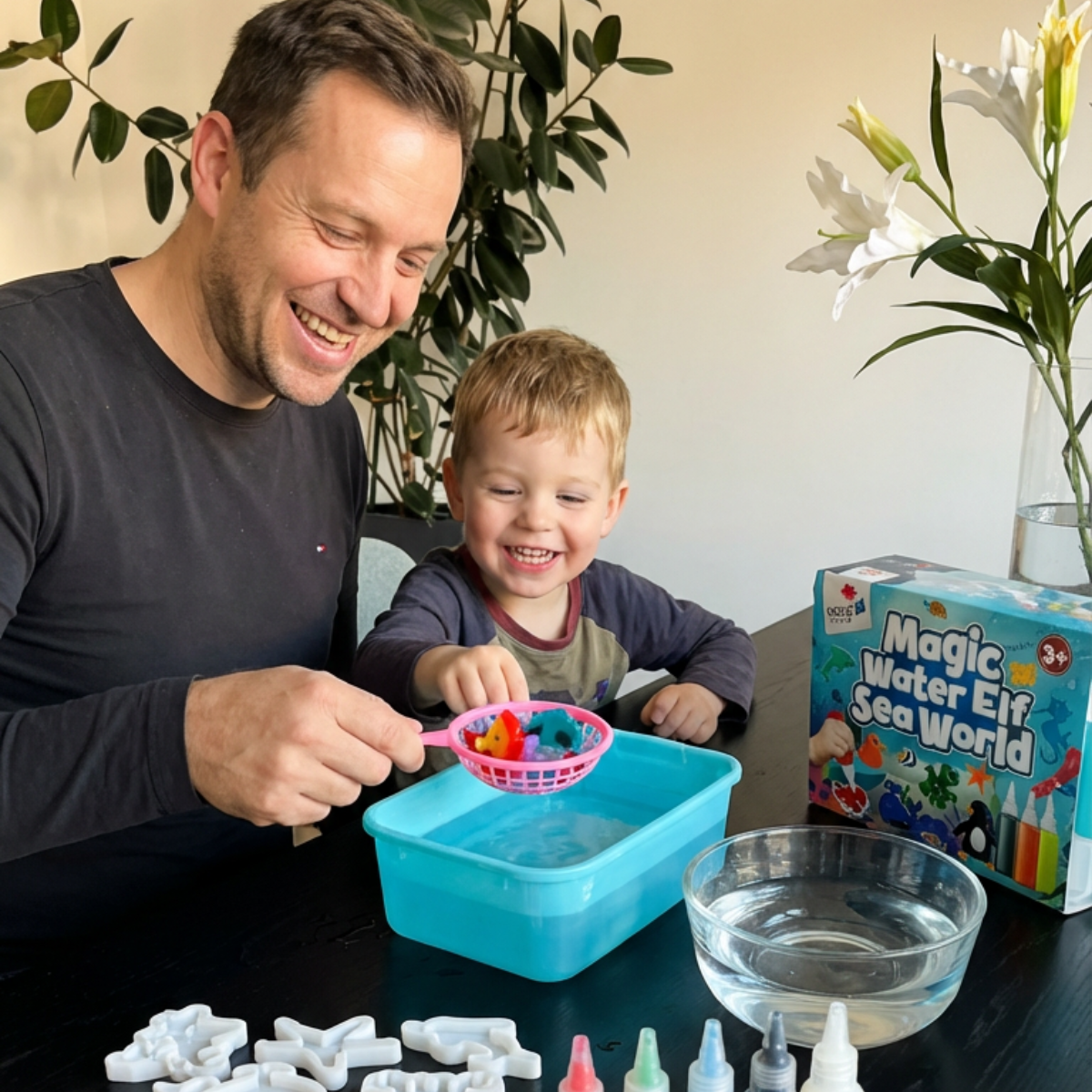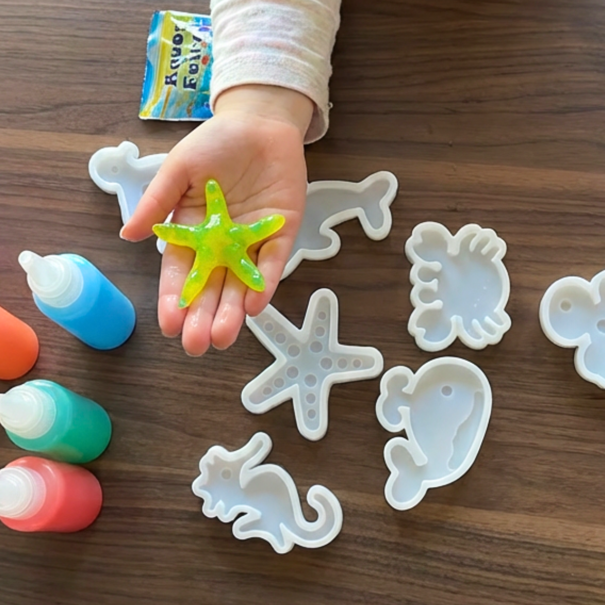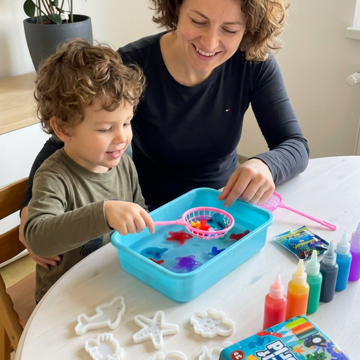21-delni ustvarjalni komplet otrokom omogoča, da z uporabo različnih barv, bleščic in vode ustvarijo svoj vodni svet, poln bleščečih morskih bitij in podvodnih prizorov. Skozi ustvarjanje otroci sproščajo svojo domišljijo, oblikujejo vodne figurice ter se na zabaven način učijo prepoznavanja barv, oblik in ročnih spretnosti.
