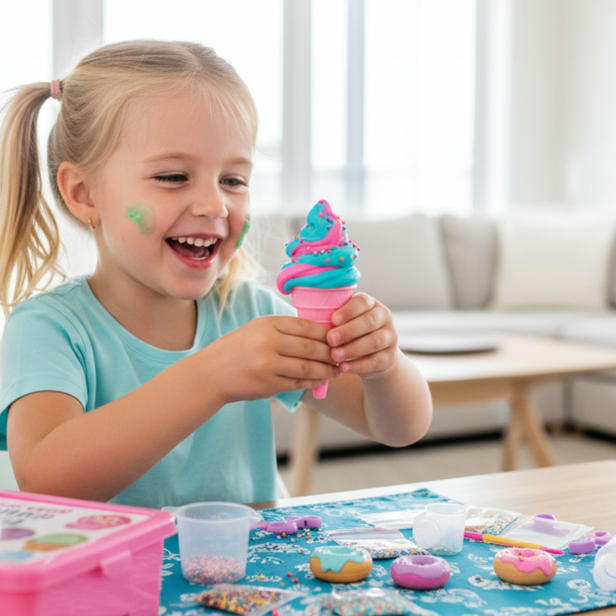 Ice Cream Slime Kit ni le igrača – otroci obožujejo mešanje barv, bleščic in sladkih dodatkov ter ustvarjanje svojega sladolednega sveta, hkrati pa razvijajo domišljijo, fino motoriko in senzorične spretnosti.